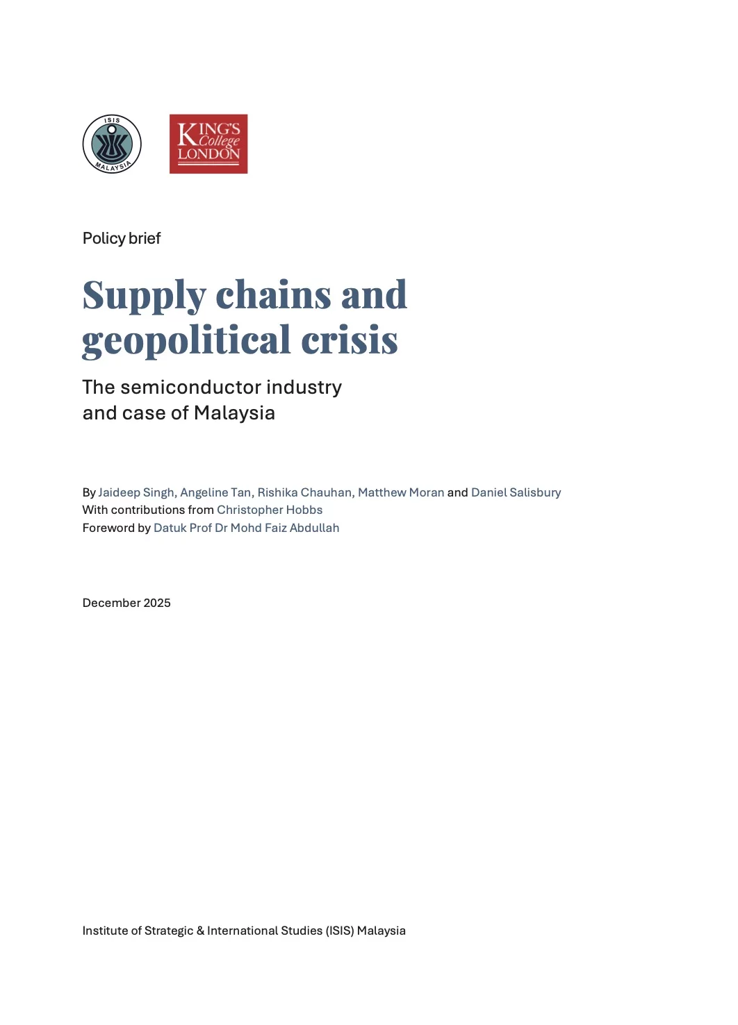 The report is structured in six parts. Building on the introduction, Section 2 considers the concept of geopolitical crisis and associated risks. To aid discussion, it sets out a loose typology of crises, their likelihood and impact. Building on the crises and potential for disruption, Section 3 moves to focus on supply chains and the vulnerabilities that make them susceptible to disruption. The key question underpinning this section is: what are the factors that contribute to supply chain vulnerability? Section 4 considers the issue of resilience and how this can be developed in global supply chains. Section 5 sets out the case study of Malaysia. The section explores Malaysia’s emergence as a critical node in global semiconductor supply chains and considers some of its risks and vulnerabilities. It also highlights measures being considered or pursued by relevant authorities in Malaysia. Section 6 concludes and presents some recommendations for measures that could enhance supply chain resilience, both in Malaysia and more broadly.